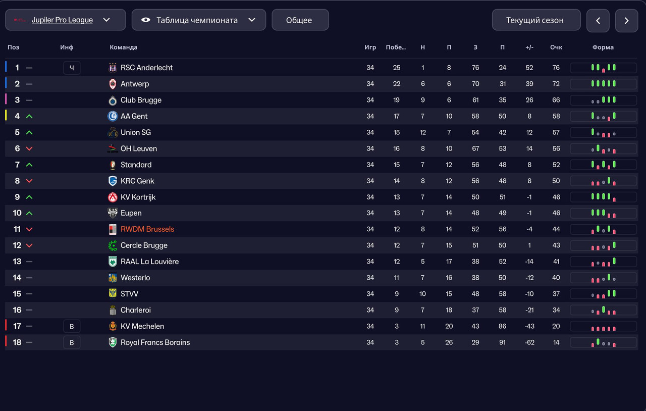 На момент вылета из еврокубка, мы уже упустили даже математический шанс на попадание в топ-5. Но финишировать слишком низко не хотелось никому, поэтому за последние 4 тура мы набрали 7 очков (победа над сильным Юнионом, разгромили Мехелен).