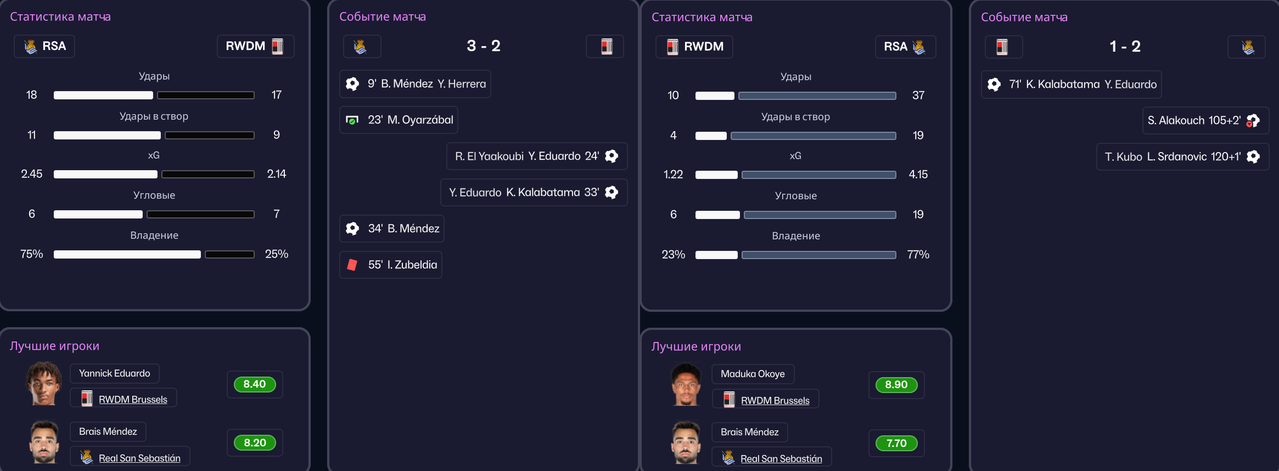 Итак, возвращаясь к матчам против Реала Сосьедада. Первый матч выдался впечатляющим, особенно в первом тайме. Игроки соперника сильнее, но мы играли очень хорошо. Жаль, что пропустили с пенальти от Оярсабаля и от Мендеза со штрафного. Если бы не эти голы, шансов у нас было бы больше. Во втором тайме у них удалился Зубельдия, и это был наш шанс на то, чтобы сравнять, но мы не смогли. Было страшно идти в атаку, так как пропустить в любом момент мы тоже могли. Поэтому в концовке матча я снизил давление на соперника и решил подойти к ответному матчу именно с таким раскладом. Второй матч - феерия Окойе. Лучший игрок матча, который в первом матче отразил пенальти и на протяжении всего матча тащил опасные удары. Гол Кабамбы перевел матч в дополнительное время, но в нем просто не повезло. Мы просто физически не выдерживали уже, не помогли даже 6 замен. Увы, Софьян Алакуш срезал мяч в свои ворота в конце первого доп.тайма. В оставшиеся 15 минут мы попытались отыграться, но не смогли, а на 120+ пропустили с углового и закономерно, справедливо вылетели.