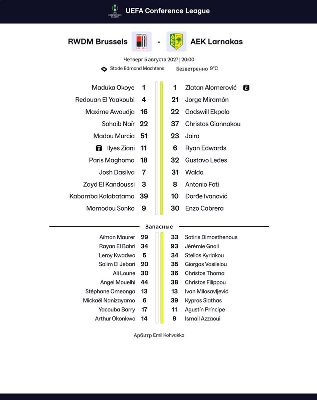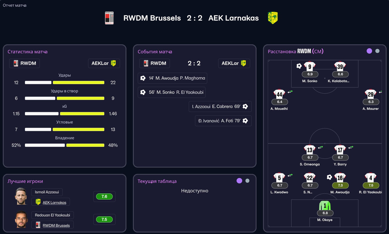 После гола мы стали играть более оборонительно. Как бы то ни было, АЕК для нас не самый легкий соперник. Первый тайм закончился со счетом 1-0. Он был под нашим контролем, и мы справедливо выигрывали. Игра поменялась сразу же после выхода на поле. АЕК стал более интенсивно атаковать, и начали появляться моменты у наших ворот. В одной из контратак мы смогли снова поразить их ворота. На этот раз отличился Момоду Сонко с передачи Эль Якуби, оба провели шикарный прошлый сезон. Можно было подумать, что игра сделана, но АЕК решил включиться и переломил ход встречи. Первый гол они забили после быстрой атаки, примерно в таком же стиле, как забил Сонко, а второй их гол - это результат очень сильного давления и череды ошибок защитников Моленбека. Итоговый счет 2-2. Счет неплохой, но не идеальный. Идеально было бы победить без проблем и сосредоточиться на матче против Стандарта в чемпионате.