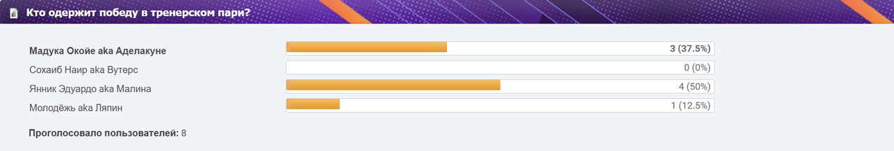 Малина, видя свое 4-е место, говорит - «Да, Яспер, твой железный Наиб всех сделал. 6222 очка против 5314,5 у Окойе Раффа. Макс с молодёжью - 4384. А я со своим золотым трансфером Эдуардо... всего 3042. Не повезло с системой подсчёта.»