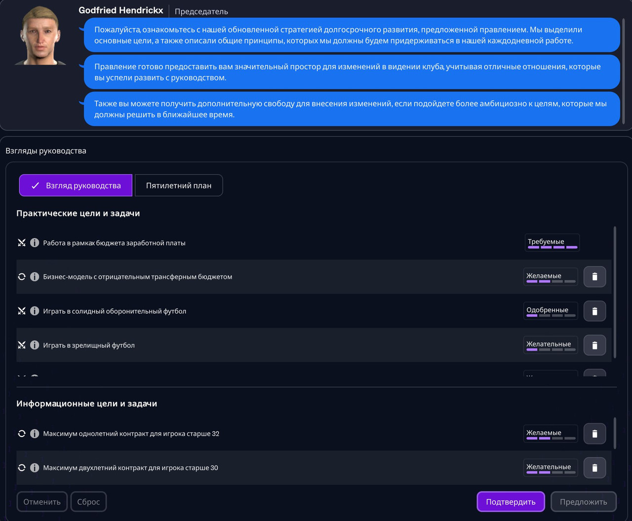 - «Принял» - Аделакуне остался доволен ответом, теперь предстоял разговор о следующем сезоне - «Значит, на будущее - фокус на чемпионат. Цель - топ-5. Ресурсы? Максим?»