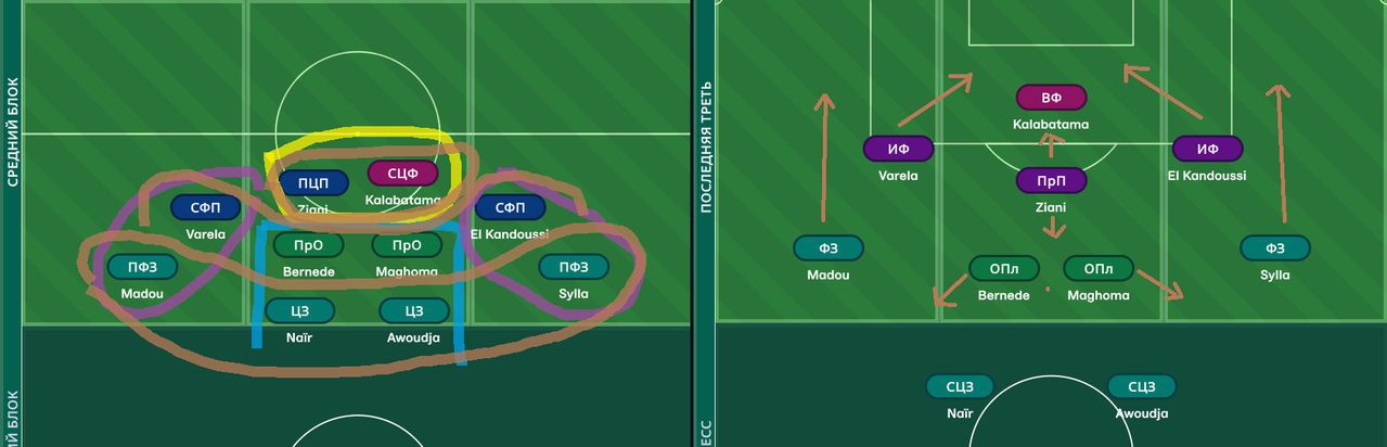 Опытным путем было выяснено, что наиболее удачная комбинация при игре без мяча - это прессингующий+перехватывающий. При среднем блоке в каждой зоне поля минимум 2 игрока. Если атака идет по центру, то там Зиани и Кабамба на первой линии прессинга, ниже Бернед и Магома, атакующие крайние полузащитники при этом возвращаются в оборону. Плюс еще есть целая линия из четырех защитников. Если атака идет по флангу, то там не только прессингующий крайний защитник, но и сопровождающий полузащитник. Они буквально зажимают между собой игрока соперника. Помимо этого ближе к флангу смещается один из опорников (они ведь оба перехватывающие)в зависимости от фланга, а зону опорника прикрывает Зиани (не полностью, конечно, но не просто формально стоит в зоне - участвует в прессинге, т.к он сам прессингующий).