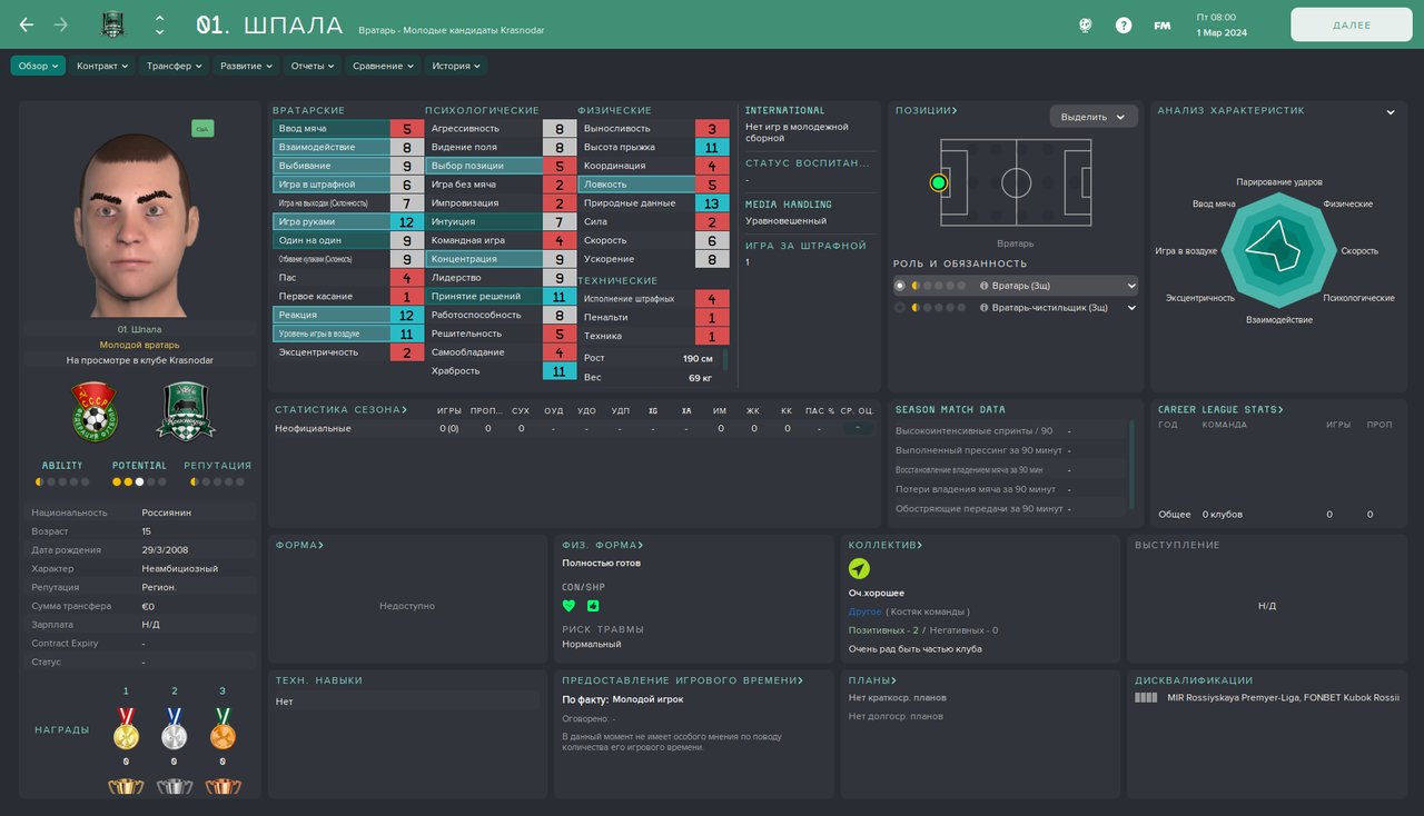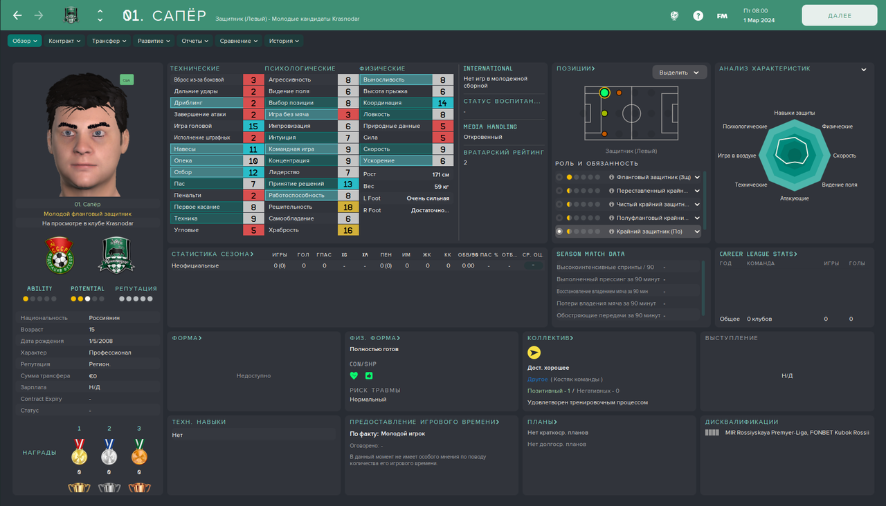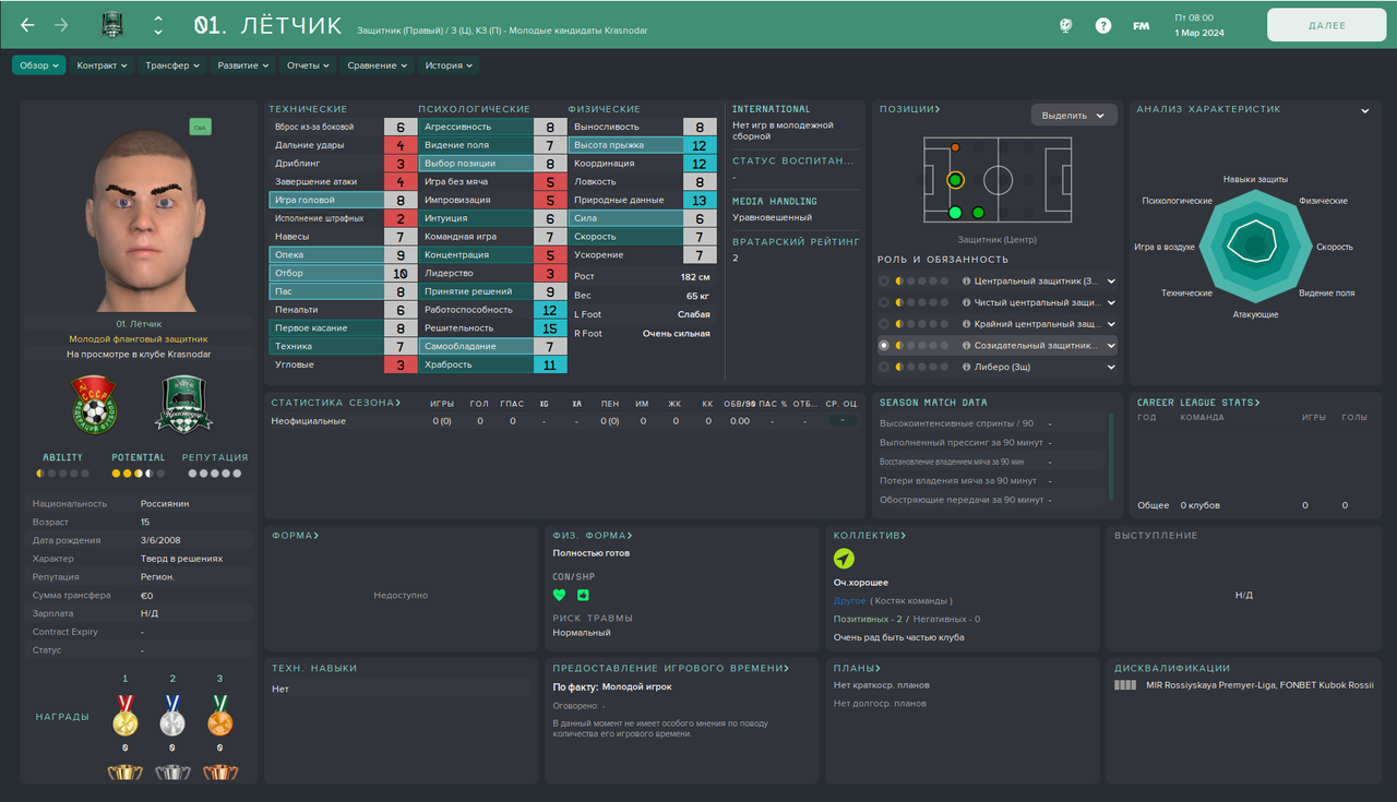 Позиция изначально указана как правый защитник, но пацан может отрабатывать по всему фронту обороны, а с учётом полного отсутствия скорости, при том прыгучести, роста и игры головой (собственно, отсюда и прозвище) - будем переучивать на центрального защитника. В принципе, набор скиллов под это дело приличный, концентрация, надеюсь, с возрастом подрастёт (ибо в обороне без неё, увы, никак), а в остальном, в принципе, молодёжке может помочь уже сейчас. И на этом парне категория "лучшие таланты" заканчивается...