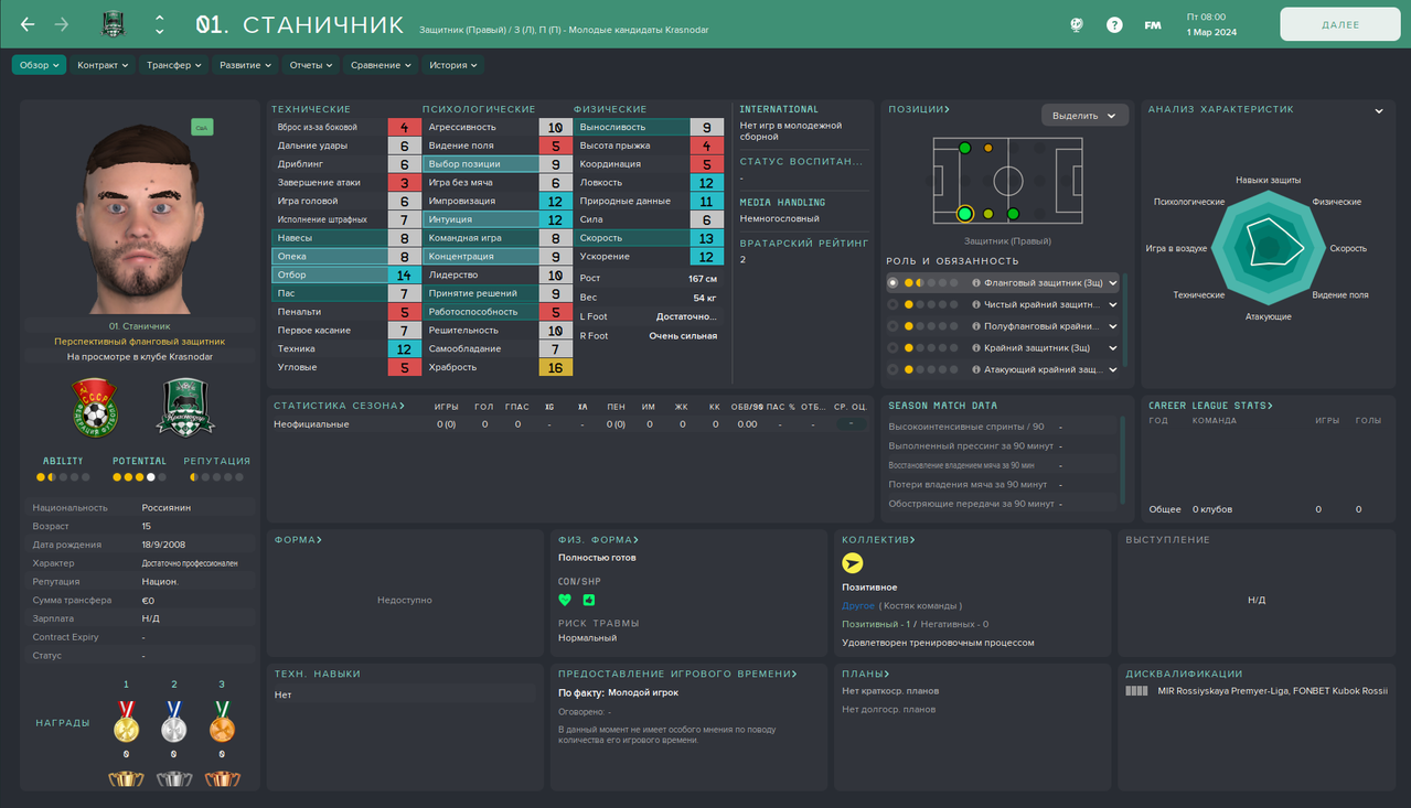 Пожалуй, самый крепкий из ребят этого набора, причём как в моменте, так и в потенциале. Этакий мелкий, шустрый, универсальный на оба фланга товарищ, который только так будет бровку вспахивать. Обидно, что при неплохом характере у пацана очень слабая работоспособность, да и с координацией проблемы. Как бы не пришлось наблюдать картину маслом, когда пацан запнётся в середине забега с мячом и некисло так грохнется. Но храбр до безумия, этого не отнять.