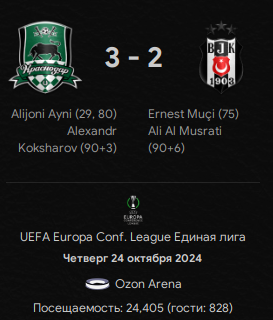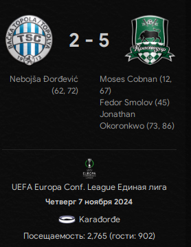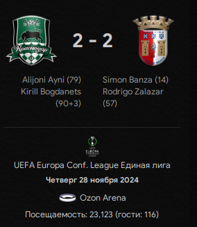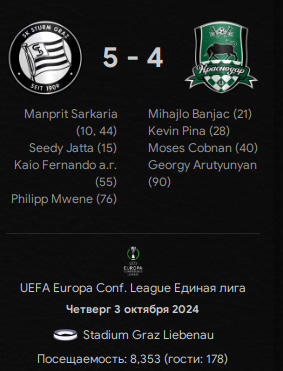 • "Краснодар" (Лига Конференций УЕФА) - 6 очков, 13 место. Подгадило нам, конечно, поражение от "Штурма" в самом начале, да... Дальше вроде бы ничего, форму набрали, но всё равно обидно. Остался у нас один крепкий соперник и два "такое себе", так что в целом должны выходить в плей-офф. Пока же - 1/16 финала, сеяные, а в возможных соперниках: "Сараево" из Боснии, швейцарский "Лугано", словацкий "ДАК 1904", португальская "Брага", румынская "Университатя", турецкий "Бешикташ", чешский "Баник" и австрийский "Хартберг".