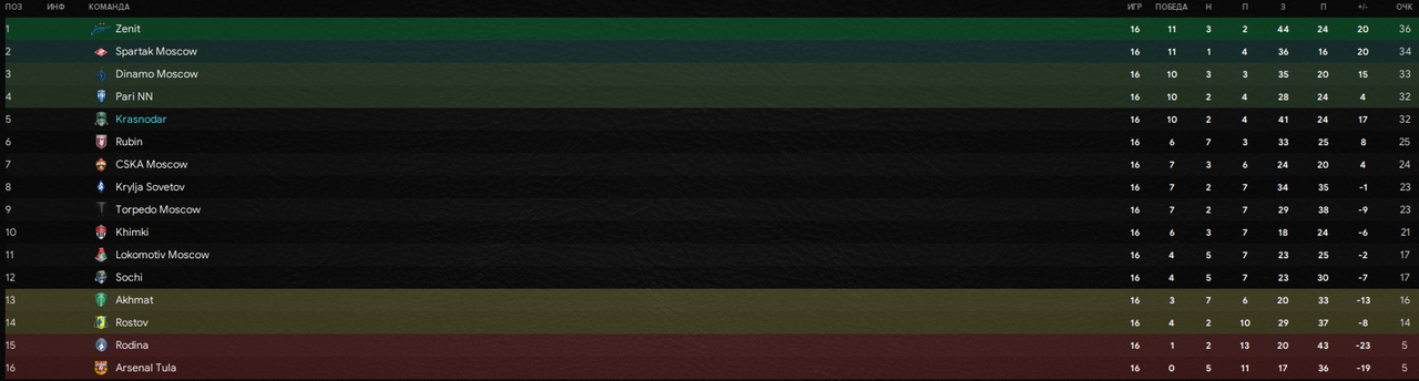 Ну что, как говорил один отдельно взятый подполковник милиции, "Подобьём бабки?". Откровенно говоря, в турнире ситуация оч-чень интересная. Лидера как такового в гонке нет, сразу пять коллективов бьются за все плюшки. И если нас видеть в этой гонке приятно, а "Зенит", "Спартак" и "Динамо" - ожидаемо, то вот "Пари НН", пожалуй, главная сенсация этой части сезона. Громких побед у команды не так много, но в списке скальпов фигурируем уже мы и "Динамо". Дальше - пропасть, команд 6 бодаются в середине таблицы промеж собой (в том числе и, увы-увы, "ЦСКА"). Об армейцах скажу особо: начали товарищи настолько отвратительно, что просто диву все давались, в какой-то момент вообще фигурировали около стыковых матчей! Благо дело, руководство показало, что бубенчики у них таки есть - отправило на мороз Марко Николича, а на замену из "Слована", который Братиславский, пришёл словак Владимир Вайсс. Пока получается годно, 7 очков из 9 в РПЛ, а в ЛЕ поражение от "Селтика" уравновешивается победой над тоже "Слованом", но уже с города Либерец. А вот "Локомотив", увы, пал почти на самое дно. Железнодорожники уже в одном балле от стыковых матчей, Михаил Галактионов уже уволен вот только что, а нового машиниста пока что ищут. И если армейцы в крайнем случае могут отбрехаться участием в еврокубках и плотным графиком, то вот у "Локо" нет даже такой хилой отмазки. Все подробности - на скрине ниже:
