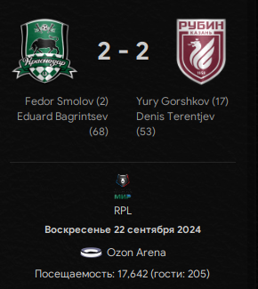 Доказали казанцы, что не зря возле еврокубковой зоны отираются на старте сезона. Равный матч, было прям тяжеловато в какие-то моменты, даже вон отыгрываться пришлось. Первый гол в сезоне для Эдуарда Багринцева.