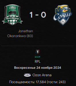 Очень тяжёлый матч выдался и очень большой кровью далась победа... Если Джонатан Окоронкво растянул икроножные мышцы и выбыл где-то на месяц, то вот у Олакунле Олусегуна всё куда конкретнее. Перелом стопы и минимум 4 месяца на больничном. А это означает, помимо всего прочего, что как бы уголёк не хотел, но зимой он вряд ли куда-то уйдёт. Ну и да, есть дебют Сапёра в главной команде, пусть и со скамейки, но вышел в перерыве и отыграл полный тайм.