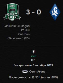 Честно говоря, игру ждал с некоторым интересом после того, как узнал, что самарцы подписали Артёма Дзюбу. А по факту - буднично, незаметно и очень просто сделали результат за 10 минут первого тайма с ещё одним дублем Джона Кордобы. Даже гол гостей как-то не расстроил, ну прастыте, когда там Роман Ежов (181 см роста) против Лукаса Оласы (173 см роста) в верховой борьбе - там как бы понятно, чем дело закончится. К слову, мы уже на этом моменте остались единственными со 100%-ным показателем по очкам.