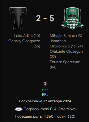 Неудивительно, что после такого избиения в команде недели сразу четверо наших. Защитники Георгий Арутюнян (1) и притворившийся защитником опорник Кевин Пина (1), "десятка" Алиджони Айни (1) и форвард Фёдор Смолов (2).