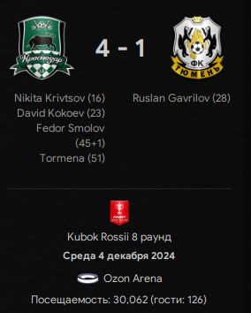 Честно скажу, хотел было я молодёжь в бой бросить, да запамятовал, что эти парни в отпуск зимний уходят раньше нас, вот и получился небольшой облом-с. Ладно, пацанам будет ещё где себя проявить, пока что вышли мы в таком, полубоевом составе и убили сразу нескольких зайцев. И ближний резерв поднатаскали (Никита Кривцов и Давид Кокоев оформили первые голы в сезоне), и морально-волевой дух команды приподняли после облома в Нижнем Новгороде. А вот в следующем раунде будет лихо - 5 марта на родимой "Ozon Арене" у нас Кубанское дерби, в 1/8 финала принимаем одного из лидеров группы "Юг" Первого дивизиона - "Кубань"!!!