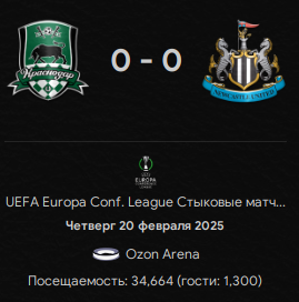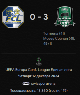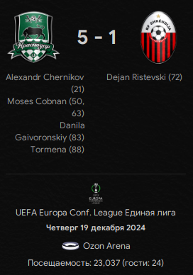 • "Краснодар" (Лига Конференций УЕФА) - 6 очков, 13 место. Подгадило нам, конечно, поражение от "Штурма" в самом начале, да... Дальше вроде бы ничего, форму набрали, но всё равно обидно. Остался у нас один крепкий соперник и два "такое себе", так что в целом должны выходить в плей-офф. Пока же - 1/16 финала, сеяные, а в возможных соперниках: "Сараево" из Боснии, швейцарский "Лугано", словацкий "ДАК 1904", португальская "Брага", румынская "Университатя", турецкий "Бешикташ", чешский "Баник" и австрийский "Хартберг".