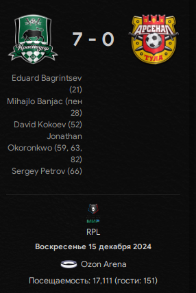 Уф, ударно проводили 2024 год на внутренней арене, ничего не скажешь. У туляков, увы мне, проблемы огромные и, скорее всего, вылет уже неизбежен, даже несмотря на то, что впереди как бы вся весенняя часть сезона. У нас хет-триком отметился Джонатан Окоронкво.