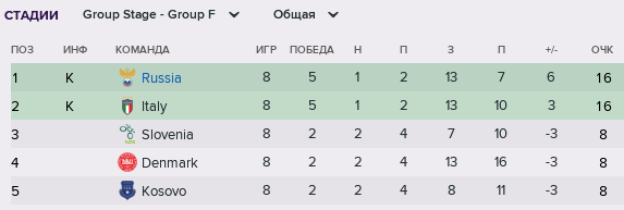 Впереди ещё 4 осенние встречи: две с косоварами, и по одной с итальянцами (дома) и словенцами (в гостях). Скуадра Адзурра пока что сыграла меньше всех и имеет 2 игры в запасе, но это не важно, ведь, на Евро выходят по две лучшие команды из каждой группы. Что означает, что надо просто спокойно брать свои очки в оставшихся матчах.