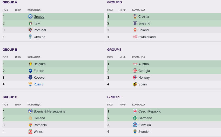 В итоге, сборная России, которой иностранные болельщики дали неофициальное почётное прозвище Русские Медведи, удержала таки своё первое место, обойдя Италию лишь по разницей голов (по личным встречам и по очкам оказалась ничья). У остальных трёх сборных также оказалось равенство и по очки (по 8), и по разнице голов (по -3), но по личным встречам (а это здесь самый главный критерий при равенстве очков) выше оказались словенцы. В 4-х группах из остальных 9-ти в борьбе за 1 либо 2 строчку всё решилось "на тоненького" в последнем туре, а в остальных пяти топ-сборные (Англия, Голландия, Испания, Германия, Франция тож)не дали повода усомниться в своей "топовости". Лишь в группе J, единственной из всех, созрела настоящая сенсация: первое место, обогнав швейцарцев лишь по разнице мячей, заняла сборная Грузии под руководством известного у нас словака Владимира Вайсса. И это, заметьте, без Хвичи!