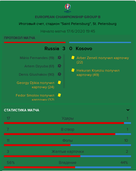 Если мы все три своих игры провели на полностью заполненной на каждом матче новенькой Arena Saint Petersburg, вместимостью 64287 зрителей, то наши соперники свои матчи проводили в Дании - на 38-тысячной Telia Parken, домашней арене Копенгагена (он Кобенхавн). Так что, им, в отличие от нас, пришлось мотаться каждый тур туда-сюда. Но, вряд ли, именно стало причиной такой слабой игры сборной Косово в этом матче. Возможно, где-то они и расслабились после своей сенсационной победы над бельгийцами в первом туре, а, возможно, сказалось и то, что, в отличие от прошлой игры, где полу-резервный состав играл, что называется, в пол-ноги, в этот раз, на поле вышла вся основа с Акинфеевым в воротах, заряженная на победу. И не оставила сенсационным косоварам ни единого шанса, буквально сметя их с поля - статистика со скрина выше говорит сама за себя.