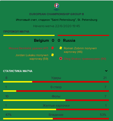 Начал разгром гостей ещё в первом тайме правый защитник Марио Фернандес, ударом головой замкнувший подачу Головина с углового, а во втором тайме продолжил Дзюба в несвойственной ему манере убежавший от защитников, выполнявший роль почётного эскорта по его стороны, а закончил вышедший на замену капитан Глушаков, выскочививший из-за спин защитников и подставивший ногу под мягкий навес (или, скорее, перекид) Джикии со штрафного. 3:0 - весомая заявка на выход из группы. Но сначала нужно, хотя бы, не проиграть злющей Бельгии, которую смели с копенгагенского поля (удары - 24-6!) французы - 2:1.