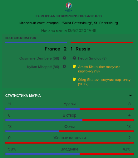 К первому матчу на Евро с действующими чемпионами мира сборная России подошла, будучи №45 в мировом рейтинги ФИФА, а французы - №2. Разницу в уровне команд ощутите сами. У них - Мбаппе, Гризманн, "Ракета" Дембеле, Погба, Н'Голо Канте, Льорис, у парней Неизвестного - Смолов, Шатов, Хубулов, Головин, Дзагоев и вернувшийся в сборную перед Евро 34-летний Акинфеев. На бумаге, вроде бы, всё ясно - шансов 0,0. Но не таковы Валерий Черчесович и его парни, чтобы стушеваться перед мощнейшей "сборной Африки", представляющей Францию. Уже на 8-й минуте Федя Смолов после навеса Арсена Хубулова от правой бровки неожиданно убежал от Варана и Ляпорта и переиграл Юго́ Льориса - 1:0! За несколько часов до этого сенсационно пробившаяся на Евро сборная Косово (№109) шокировала всю Бельгию (№3), чья сборная всю игру штурмовала ворота Самира Уйка́ни из Ризеспора и смогла забить лишь "гол престижа" на 89-й минуте игры - 2:1. И, вдруг, назревает вторая сенсация подряд...