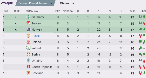 На самом деле, всё оказалось ещё интереснее - особенно после победы косоваров над бельгийцами в первом туре :smyle: А для того, чтобы пройти должно быть хватить 3 очков, но то такое. На реальном Евро-2020 даже 3 очков оказалось недостаточно для прохода дальше и выхода в плей-офф: победителя среди трёх сборных определяли по дополнительным показателям. Насколько я понимаю, тогда всё решила лучшая разница мячей. Но мы до этой "лотерии" тянуть не стали, но об этом ниже.