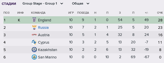 Столь бодрое начало отборочного турнира вселило надежду на удачный его исход - все остальные соперники были сборной Неизвестного вполне по зубам, нужно было брать свои очки и обыгрывать дома англичан во второй встрече. В двух летних матчах парни спокойно, на классе, взяли свои 6 очков с Казахстаном и Кипром. Причём, с казахи в гостях всё началось со случайного автогола молодого ЦЗ Тихонова на 17-й минуте встречи, но сенсации не произошло: уже к перерыву счёт был 2:1 в пользу гостей. С Кипром тоже получилась достаточно простая игра. За оба матча игроки нашей сборной суммарно нанесли 71 удар в по воротам своих соперников, а по своим дали ударить лишь 7 раз. Что здесь комментировать?