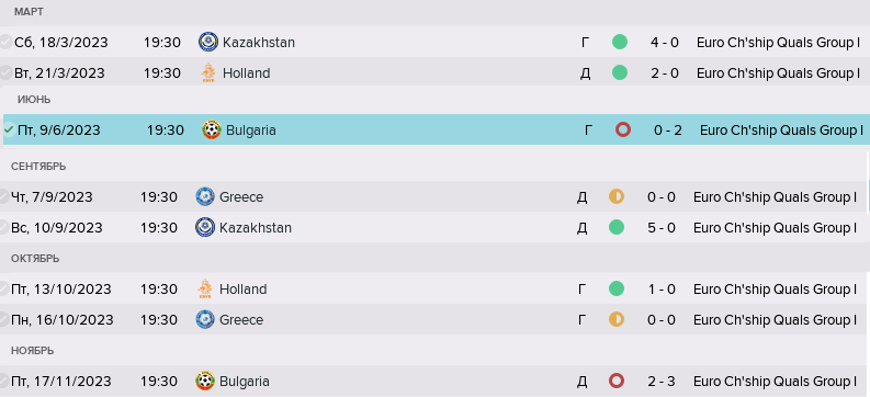После жеребьёвки всё было понятно: мы и голландцы должны были разыграть первое место и прямую путёвку на ЕВРО-2024. Греция здесь выступала в роли Австрии в отборе на ЧМ-2022, а сраная Болгария не выступала вообще никак, они в нашей группе аутсайдеры наравне с Казахстаном. И вот эти аутсайдеры с какого-то хрена вдруг берут и "нятягивают" всех, включая нас. Мы ничего не смогли сделать с ними в первой игре в гостях, хотя нанесли аж 26 ударов по их воротам, а они - всего 5, но этого им хватило для победы со счётом 2:0. И это уже был первый звоночек...