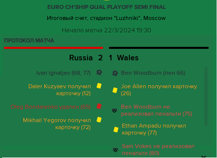 "Ну ладно, уж валлийцев-то мы и без Головина победим..." - думаю я, и начинаю матч. Как бы не так. Весь первый тайм проходит на равных, и, как результат - 0:0 на табло. Я решаю выпустить Головина на замену для усиления нашей атаки... понимаю, что я забыл его включить в заявку на матч. Да что ж такое-то!? Пришлось рискнуть и заменить ЦП Уткина на второго форварда Ивана Игнатьева из Зенита, за который он в этом сезоне наколотил 11 голов в 17-ти матчах.