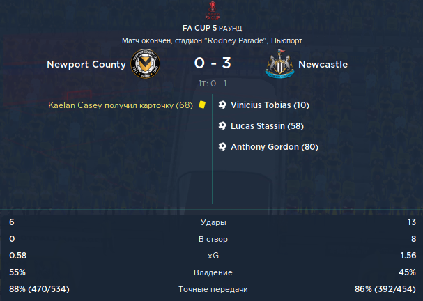 Несмотря на минимальную победу, очень уверенная игра от Ньюпорта, насоздавали более чем на 3 xG, а допустили только 0,1. Единственный гол на счету Мьюира)
