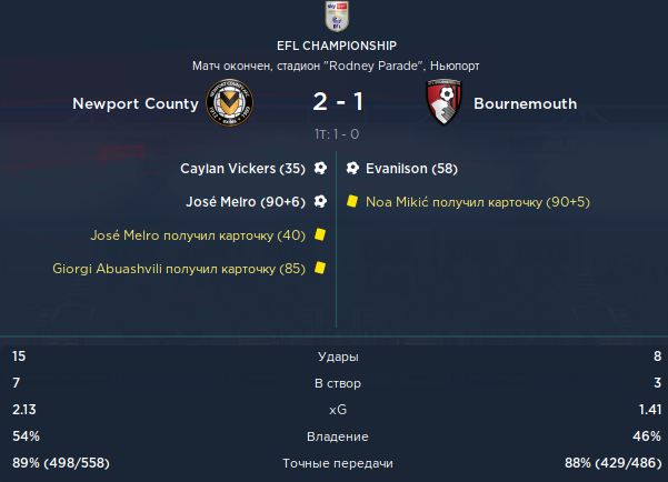 Ли перехватил пас на чужой трети поля, отдал на Абуашвили, а тот выкатил мяч на убойную позицию Викерсу, не оставившего шансов вратарю. Эванилсон сравнял после прострела во вратарскую. Но на последних секундах дополнительного времени Мелро здорово открылся в штрафной под передачу Тарли и пробил на технику. Ньюпорт не просто обыграл лидера чемпионата, но и был лучше по игре)