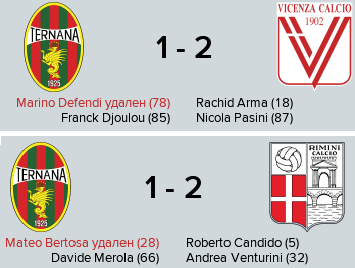 Следующие два матча снова, как под копирку. Оба раза мы превзошли наших соперников по ударам и атакующим действиям, но оба раза проиграли у себя дома с одинаковым счётом - 1:2. На этот раз, с другим вратарём - набирающим форму после месячной травмы Янарилли. Правда, соперники были не из простых: Виченца перед перерывом на матчи сборных идёт 2-й, а "курортники" из Римини (солнце, море, прекрасные девушки) - 5-ми. С Виченцей мы даже отыгрались в концовке матча и пошли вперёд, в попытке устроить навал и вырвать таки победу, но пропустили сами... Обидно.