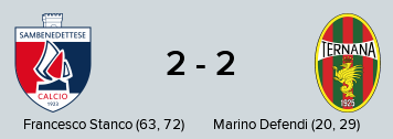 То, чего я боялся в этой игре - то, в итоге, и произошло. Вы будете смеяться, но наш основной вратарь Винченцо Аридита́ все предыдущие 6 матчей сыграл по одной схеме - 2-0-0,2-0-0. И после первого тайма, который мы отыграли превосходно, а вышедший впервые после травмы ЦП Дефэнди оформил дубль, казалось, что это просто совпадение. Оказалось, что только казалось :smyle: Во втором тайме уже хозяева поля из Санбенедеттезе ответили дублем на дубль, а Винченцо, как от него и ждали, пропустил дважды. Надо бы проверить, не играет ли он на тотализаторе? :smyle: