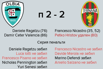 Но я никак не ожидал "поймать" дежа-вю в этой игре. Снова мы ведём 2:0 после первого тайма, снова дубль оформляет один из наших игроков (на сей раз, вышедший впервые в сезоне АПП Никастро, отзаявленный в лиге, но имеющий право играть в кубке), снова мы пропускаем дважды во втором тайме (на этот раз, обошлось без ответного дубля) и снова играем вничью 2:2. И снова в воротах - Винченцо Аридита́. Нет, он точно играет на тото, блин... Отчасти извиняет нас то, что этот матч мы доигрывали вдесятером - молодой болгарин, ЦЗ Пе́тко Хри́стов схлопотал прямую "красную" карточку за прыжок двумя ногами в своей штрафной. Ну и серия пенальти, опять же, в которой оба вратаря показывали  чудеса ловкости: Винченцо взял 2 пенальти, а Леонардо, кипер хозяев поля - 3! Это и помогло Ольбии (на местном диалекте Сардинии - Терраноа, то бишь, Новоземельску) пройти дальше и выйти в 1\8 финала, где заметное преимущество имеют клубы из группы А (7 против 5 из группы Б и 4 из группы С).