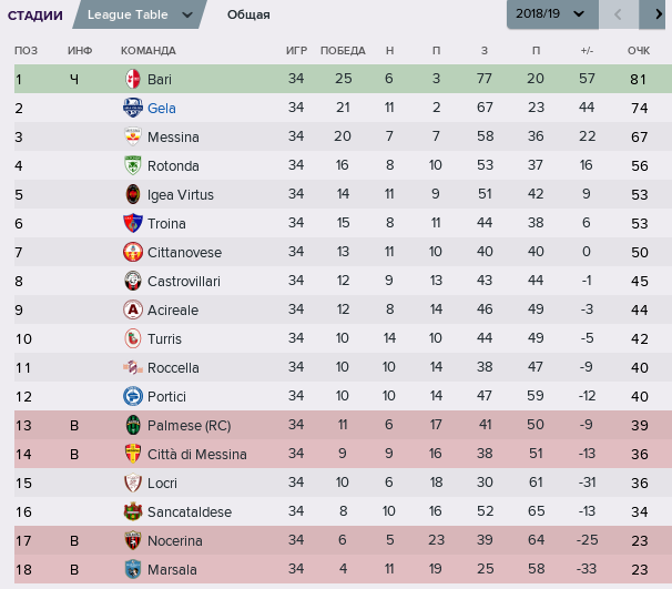 Первый сезон получился несколько неоднозначный. С одной стороны, от нас никто ничего не ждал, с другой - нам чуть-чуть не хватило до 1-го места, всё решилось буквально за 2-3 тура до финиша. До этого и Бари Каримыч, и Мессина соперничали больше друг с другом, а иногда и с нами за 1-2 места. До окончания плей-офф я не знал, что он ничего не даёт - поэтому, по ходу сезона поставил себе цель попасть в него и, затем, получить повышение. Ага, щаз! :smyle: Уже в полуфинале с клубом Иджэа Виртус Барчеллона (оцените название! :smyle:) из коммуны Барчелло́на-По́ццо-ди-Го́тто на противоположном от нас северо-восточном конце острова Сицилия пришлось изрядно понервничать, пропустив второй ответный гол на 88-й минуте и пройдя дальше, в финал, только за счёт более высокого места в регулярном чемпионате. В финале плей-офф подозрительно легко были побеждены их соседи из Мессины - видимо, они заранее что-то знали :smyle: И вот, тут-то, когда мы уже праздновали победу в своём плей-офф и ждали заветного повышения в Серию С, и оказалось, что весь этот плей-офф - просто фикция. Сезон закончился, начался новый, а мы всё в той же Серии Д...