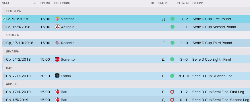 В Кубке Италии Серии Д мы дошли аж до полуфинала - я сам не ожидал от нас такой прыти. честно говоря. Где были биты "петушками" из Бари в двухраундовом противостоянии - единственном, кстати, за весь Кубок, да ещё и в самом конце сезона. Зачем да на што это сделано? А х его з! :smyle: Но, видимо, борьба за промоушен отняла у них много сил - и в финале они проиграли (0:2) Редджине (в игре - Редджо Аудаче), а, затем, слили и мини-турнир за победу в самой Серии Д. Ну а чего надрываться, в самом деле? Промоушен есть - и это самое главное. А пиписьками меряться, кто там в Серии Д круче всех - ну, такое себе :smyle:
