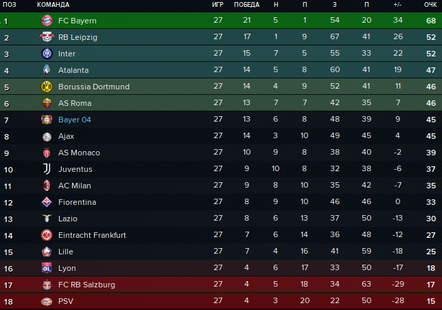 Наконец-то оная таблица начала расслаиваться. "Бавария" уже официально застолбила за собой место в еврокубках и должно случиться что-то воистину невероятное, чтоб первый чемпионский титул Империи проехал мимо Мюнхена. "Интер" с "РБ Лейпциг" будут вовсю отстаивать медали, а вот за ещё одно место в ЛЧ сражаются разом 5 команд! Помимо нас, грешных, тут "Аталанта", "Боруссия", "Рома" и "Аякс". Дальше большой пул товарищей, которым уже ничего особо не надо, к ним, к слову, прилепились снизу "Айнтрахт" и "Лилль", недавно ещё дравшиеся за жизнь. А вот на расстоянии от 7 до 10 баллов от "догов" 3 потенциальных неудачника: "Лион", "РБ Зальцбург" и "ПСВ". Все прочие подробности - на скрине ниже: