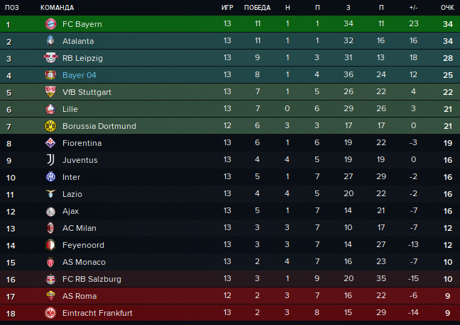 Посмотрим в таблицу. Пока больше всех удивляет "Аталанта", бергамаски с самой "Баварией" на равных прут! Дальше имеет место быть "РБ Лейпциг", следом мы, а потом очень плотный пелотон. Внизу пока явных аутсайдеров нет, "в моменте" в стыки второй раз подряд отправился бы "РБ Зальцбург", а прямой вылет присветил бы "Роме" и "Айнтрахту". Все прочие подробности - на скрине ниже: