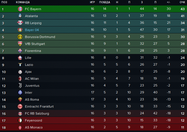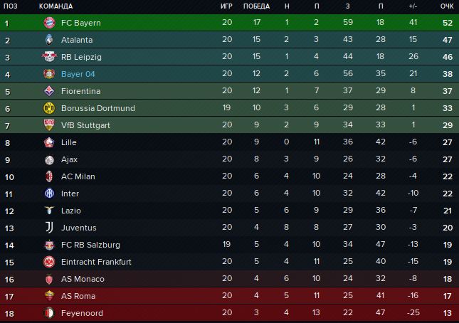 Что касается турнирной ситуации. "Бавария" потихоньку отрывается, более того, "Аталанту" уже достал "РБ Лейпциг" и бергамаскам больше теперь думок об обороне второго места, чем о рывке к титулу. Дальше за зону ЛЧ бодаемся мы, "Фиорентина" и по потерянным "Боруссия". К борьбе за еврокубковую зону, помимо "Штутгарта", подключились "Лилль" и "Аякс", а дальше... Вся вторая половина таблицы утопталась в пределах 5 очков! Уф... Все подробности - на скрине ниже: